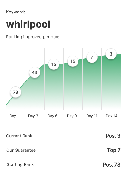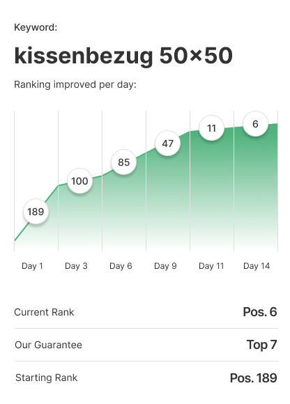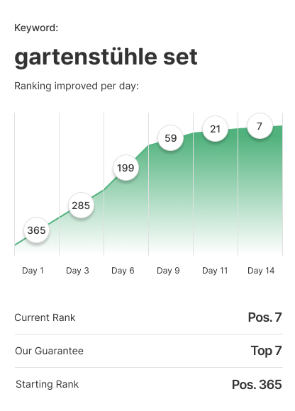 After 24 to 48 hours of receiving our XXXLutz SEO Guide, your ranking campaign will start. We will start closely monitoring your product page and improve its rankings through various methods, which is our secret sauce. We cannot divulge our exact methods, but it revolves around generating SEO signals that XXXLutz likes to see.